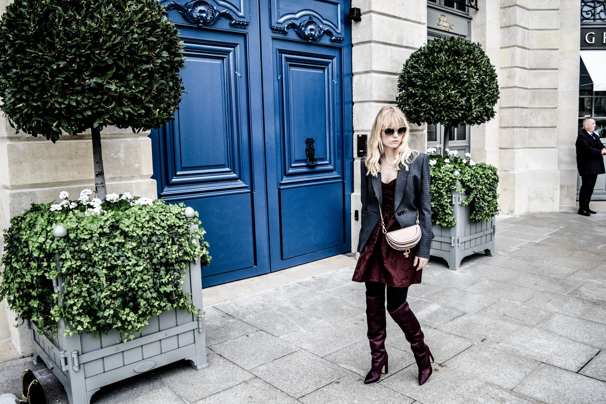For my look I started with a bordeaux colored dress from John Galliano and matched it with Zara overknee boots which almost had the same color. The special pattern on the dress made me think of the beautiful furniture and curtains one can find in Versailles. To brake the somewhat chic and festive style I added a blazer from Courréges with a check pattern that is really hot right now. Without a bag no look is really complete! I decided to go with my Chloé Nile Bag which would also brighten up the look a little. Oh yeah and not to forget my sunglasses by Chloé since you cannot do fashion week without sunnies!//